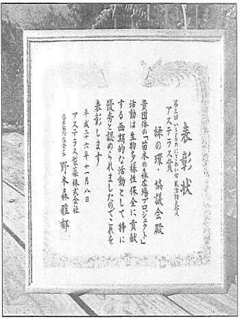 受賞は、苗木の森広場プロジェクトが生物多様性保全に貢献したものであり、山砂採取のため森が皆伐され大穴となった約2haの土地を水源涵養林に戻すため、地元のドングリから芽を育て、1000の苗木から新しい森の形が見えてきたとの評価を得たものであります。