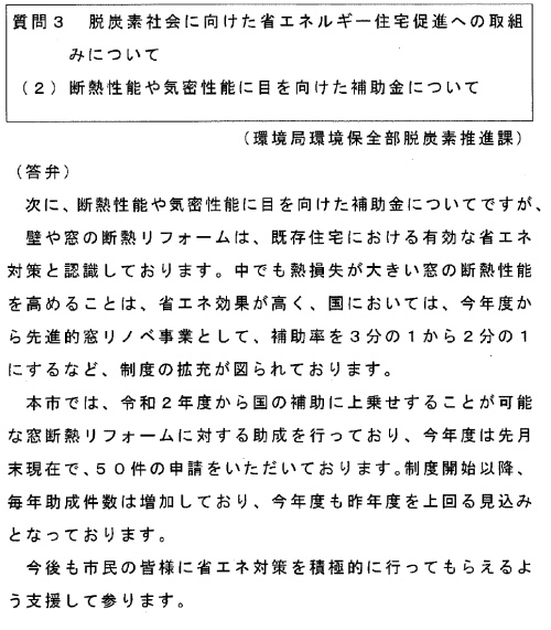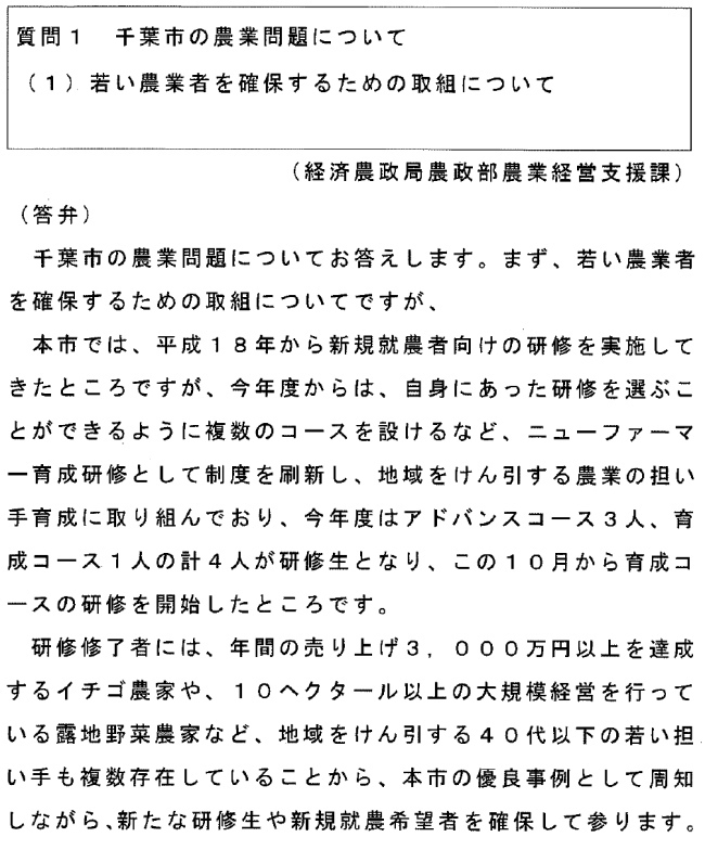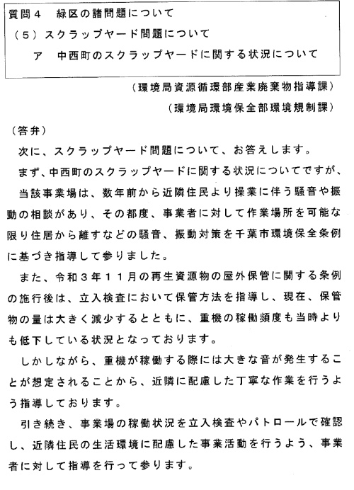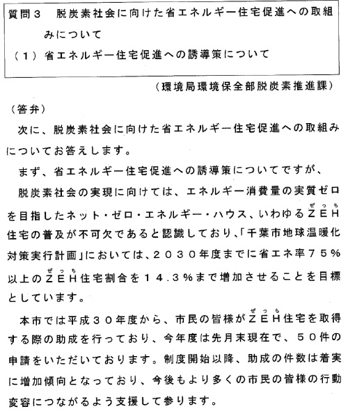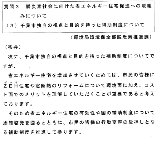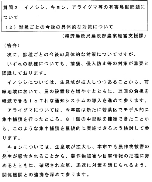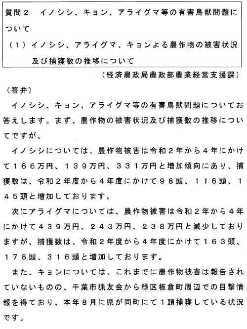 令和5年 第4回 定例会 会議録 12月12日 1 千葉市の農業問題について 2 イノシシとキョン、アライグマ等の有害鳥獣対策について 3 脱炭素社会に向けた省エネルギー住宅促進への取組につい て 4 緑区の諸問題について (1)旧千葉外房有料道路高田インターチェンジのフルインタ ー化整備状況について (2)誉田町2丁目地先交差点の整備について (3)誉田駅前線の下水道工事について (4)誉田東小学校の狭隘なグラウンドの解決策について (5)スクラップヤード問題について ![]() みなさん、こんにちは。 自由民主党千葉市議会議員団の三須和夫でございます。 これまで取り上げている項目も多いですが、重要であると考える課題を取り上げております。頑張りますので、よろしくお願いいたします。 1 農業問題について はじめに、千葉市の農業問題についてです。 全国的に高齢化が進展し、担い手がどんどん減少していることを危惧しております。本市においても、農業従事者の平均年齢は68.4歳で、高齢化が進んでいる状況です。農業経営体数も、2010年は1,592あったものが、2020年は911へと減っています。 実際に、私の周辺の農家は高齢で、かつ、後継者がいない方も多く、「農家は自分の代で終わりだ。」とか、「農業は大変だし、儲からないから継がせたくない」といった声を聞きます。 ? このような中、担い手となる若者の確保・育成は、本市の農業を持続させていくうえで、極めて重要です。本市では、新規就農者の育成に係る取組みを強化していると思いますが、研修内容やその後の営農状況についても気になるところです。 また、若者に就農を促すためにも、若者に農業が魅力的な職業だと感じてもらうことが必要ではないでしょうか。農政センターでは、営農指導やスマート農業技術の実証実験等により、農業者の支援を行っていると認識していますが、実際に就農している若い農業者の営農状況も参考にしながら、農業に希望をもって取り組めるような支援が必要だと考えます。 そこで、2点伺います。 1つに、若い農業者を確保するための取組みについて 2つに、若い農業者への営農支援について お答えください。 ![]() ![]() 2 有害鳥獣対策について 次に、イノシシとキョン、アライグマ等の有害鳥獣対策についてです。 これまでの質問により、イノシシへの対策が強化されつつある点は認めますが、拡大は収まっておらず、さらなる対策が必要であると思います。先日、テレビや新聞報道にもあった通り、イノシシが中央区に出没し、捕り物騒ぎになりました。今回の出没地域では、イノシシが住めるような環境は無く、どこかから迷い込んだものと思います。 一方で、本年6月に若葉区で15頭が捕獲された件については、緑区から生息域が拡大しつつある証拠だろうと考えています。イノシシは、農作物の食害のほか、田畑を掘り起してしまうなどの被害も問題になります。 次に、アライグマです。ここ数年は目撃や被害を多く聞くようになりました。トウモロコシや落花生など野菜の食害が多いようですが、果樹なども被害にあっていると聞いています。 また、最近ではキョンも気がかりです。 以前から県南部では問題となっていたキョンが、隣の市原市など、県中部まで急速に拡大していると聞いています。私もそれらしき鳴き声を地元で聞いております。シカの仲間で草食性が強いため、野菜の種類によっては丸坊主にされてしまうそうで、市内に入ってこないよう、そして定着しないような対策が望まれます。 これらの有害鳥獣は、被害の特徴は違うものの、いずれも生息域の拡大や数の増加が懸念され、被害を最小限にするため、獣種に応じた対策をしていく必要があると思います。 そこで、2点質問します。 1つに、イノシシ、アライグマ、キョンによる農作物(のうさくぶつ)の被害状況及び捕獲数の推移について 2つに、獣種(じゅうしゅ)ごとの今後の具体的な対策について質問します 。 ![]() ![]() 3 省エネルギー住宅促進について 次に、脱炭素社会に向けた省エネルギー住宅促進への取組みについてです。 2050年カーボンニュートラルの実現に向けて、本市は、本年3月に新たな「地球温暖化対策実行計画」を策定し、 2030年度までに2013年度比で、温室効果ガス48%の削減を目指すとともに、更なる高みとして50%の削減を目指すことを宣言しました。 今回はその取組みの6つの柱の一つとなる「住宅・建築物のネット・ゼロ・エネルギー化」について取り上げます。市民や事業者が行うアクションとして、壁や窓の断熱リフォームや、新築時のZEH(ぜっち)やZEB(ぜぶ)の検討が 例示されています。 現在、日本の住宅の9割は省エネ基準に満たないため、国も昨年から、窓の断熱リフォームに加えて、壁の断熱リフォームにも大型の補助金を出し、住宅部門の温室効果ガスを減らそうとしています。 また、省エネ住宅を新築する若者世帯に70万円〜100万円の補助金を付けたり、省エネレベルの高い住宅ほど住宅ローン控除の借入