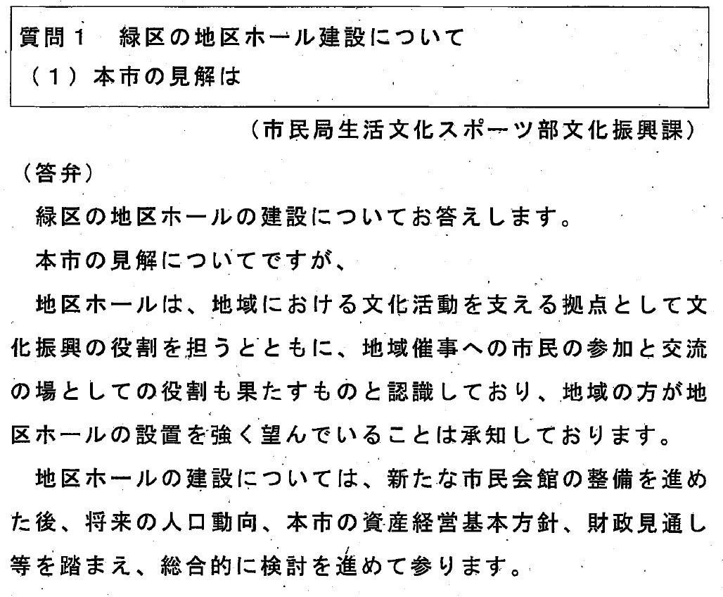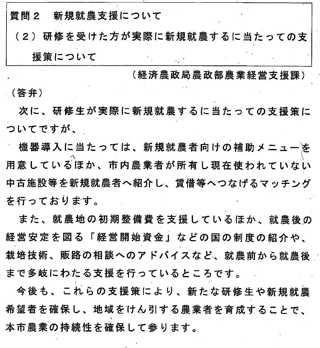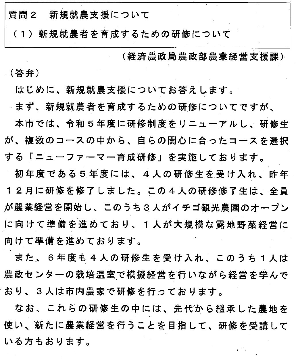 令和7年 第2回 定例会 会議録 6月19日 1 緑区の地区ホール建設について 2 新規就農支援について 3 有害鳥獣対策について 4 誉田地区周辺の道路整備について 5 椎名公民館の早期整備について 6 誉田東小学校の児童数増への対応について 7 椎名小学校の今後のあり方について 8 誉田町の廃プラスチック堆積問題について 自由民主党千葉市議会議員団の三須和夫でございます。 このたび議員生活30年目を迎えることとなりました。これもひとえに、地域住民の 引き続き、地域住民の様々な意見や要望に真摯に耳を傾けながら、これを政策に反映させるべく、全力で取り組んで参りますので、どうぞよろしくお願い申し上げます。 それでは、通告に従いまして、質問を行います。 1 緑区の地区ホール建設について はじめに、緑区の地区ホール建設について、伺います。 地区ホールについては、地元の人々が集い、地域に賑わいが創出される、文化活動の発表などの晴れの場として、大いに望まれている文化施設であります。 また、子供たちが、文化芸術に触れることができる場として、子供たちの豊かな感性と創造性を高め、次代の文化芸術を担う人材の育成に大きく貢献するとともに、地元に対する誇りの醸成にもつながるものとも考えています。 これまでも、地元の願いでもある地区ホール建設について、重ねて質問、要望を行ってきたところではありますが、改めて伺います。 区民の願いである緑区における地区ホールの建設の本市の見解について、 お答えください。 2 新規就農支援について 次に、新規就農支援について、伺います。 本市農業に限らず、全国的に農業者の高齢化が進み、担い手が減少の一途をたどっております。 私の知っている農家さんには、先祖から 本市では、若い農業者を確保するため、 そこで、2点、お伺いいたします。 1点目に、新規就農者を育成するための研修について 2点目に、研修を受けた方が実際に新規就農するにあたっての支援策について お答えください。
