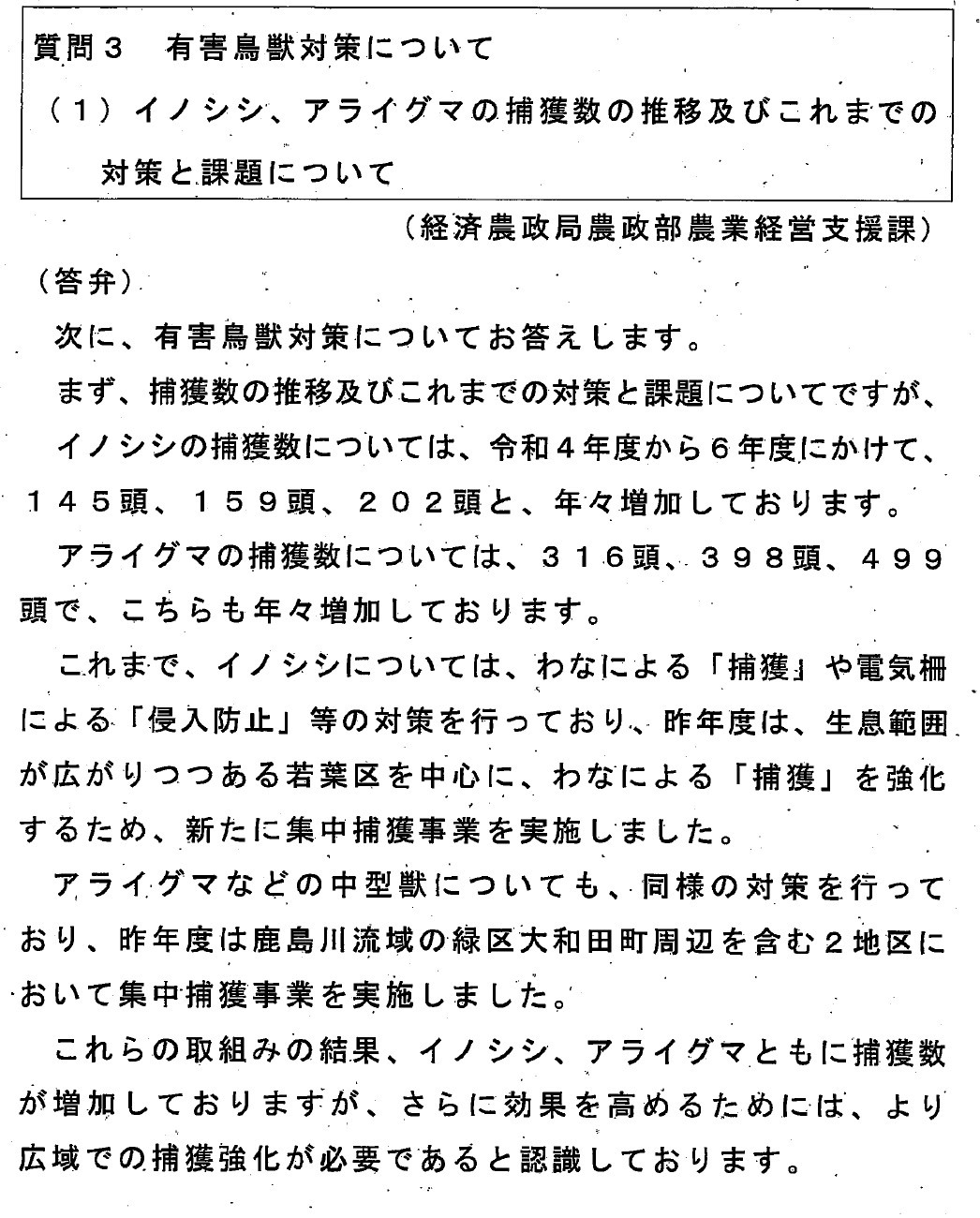 3 有害鳥獣対策について 次に、有害鳥獣対策について伺います。 これまで度々質問させていただき、本市の対策が年々強化されている点は認めていますが、被害は未だに収束しておらず、引き続き、しっかりと対策を進めていく必要があります。 まず、イノシシですが、最近では土気町 次にアライグマですが、こちらも、ここ 令和5年度から、中型獣の集中捕獲が実施され、農作物被害の軽減に一定の効果があったようですが、被害は続いていることから、地域にあった方法で有害鳥獣対策を実施していただきたいと思います。 そこで、2点伺います。 1点目に、イノシシ、アライグマの捕獲数の推移とこれまでの対策と課題について、 2点目に、今年度実施するイノシシ及びアライグマの集中捕獲事業について、 お答えください。