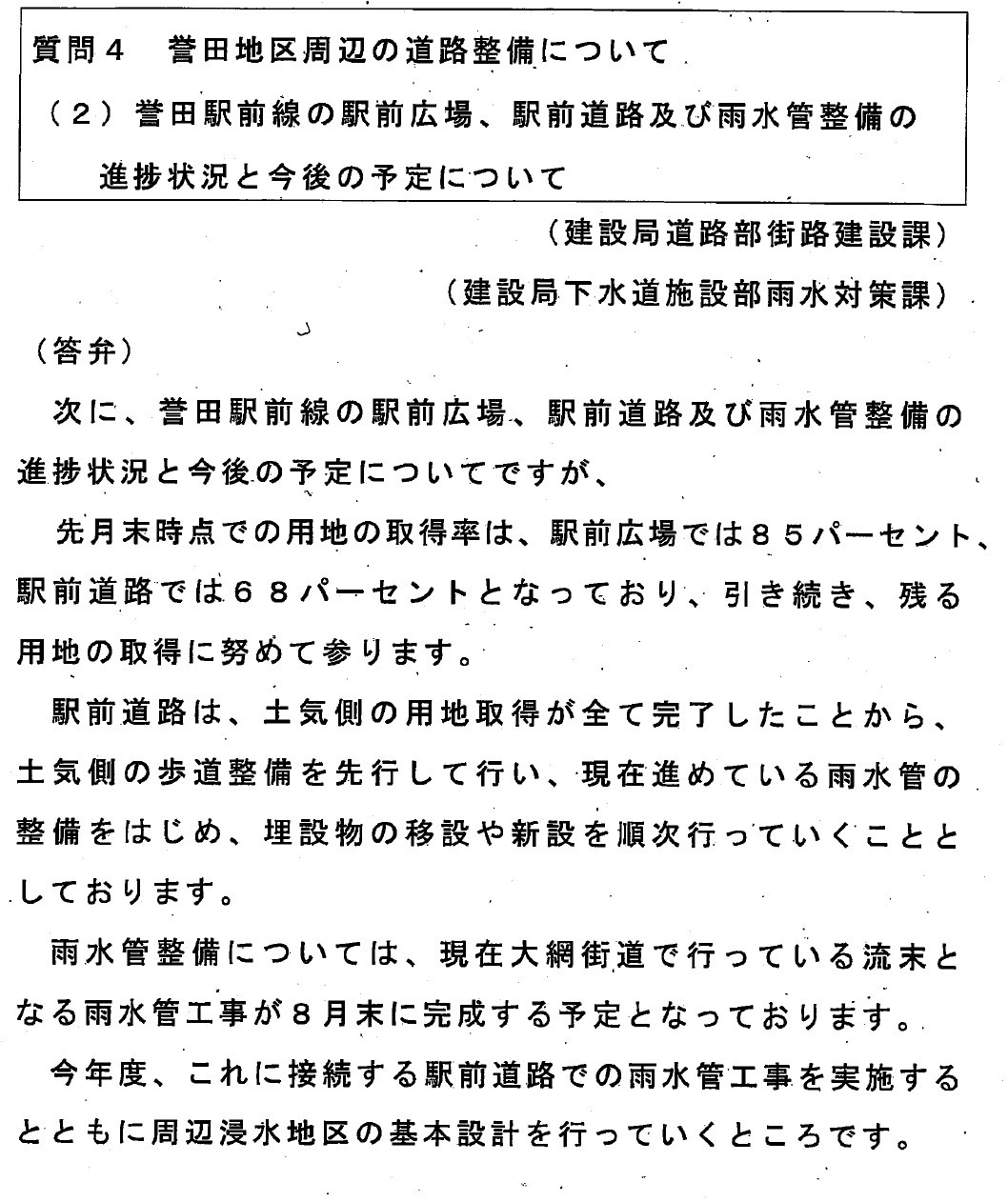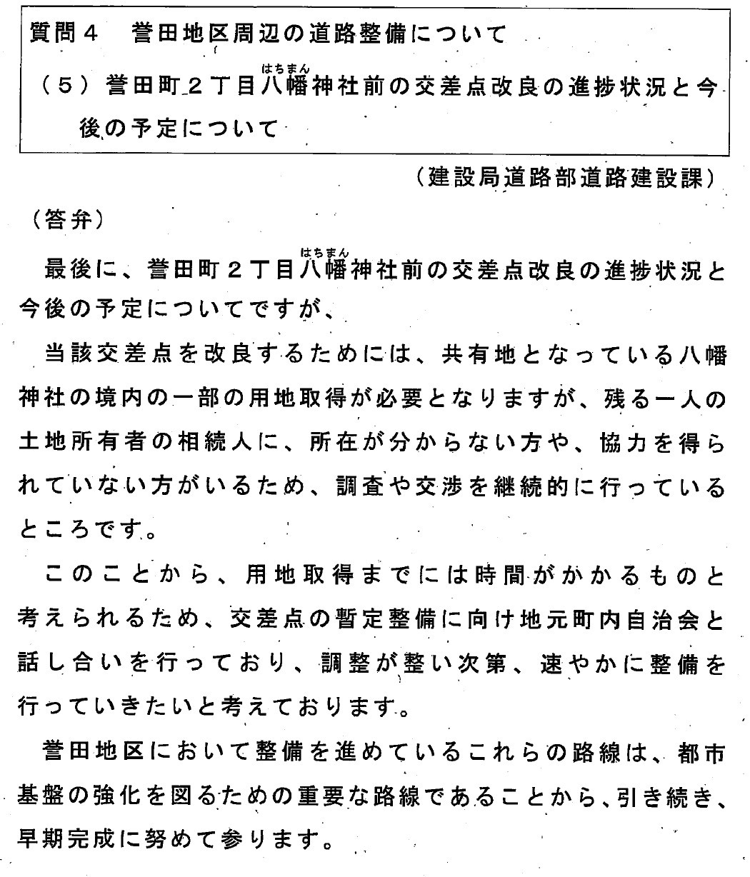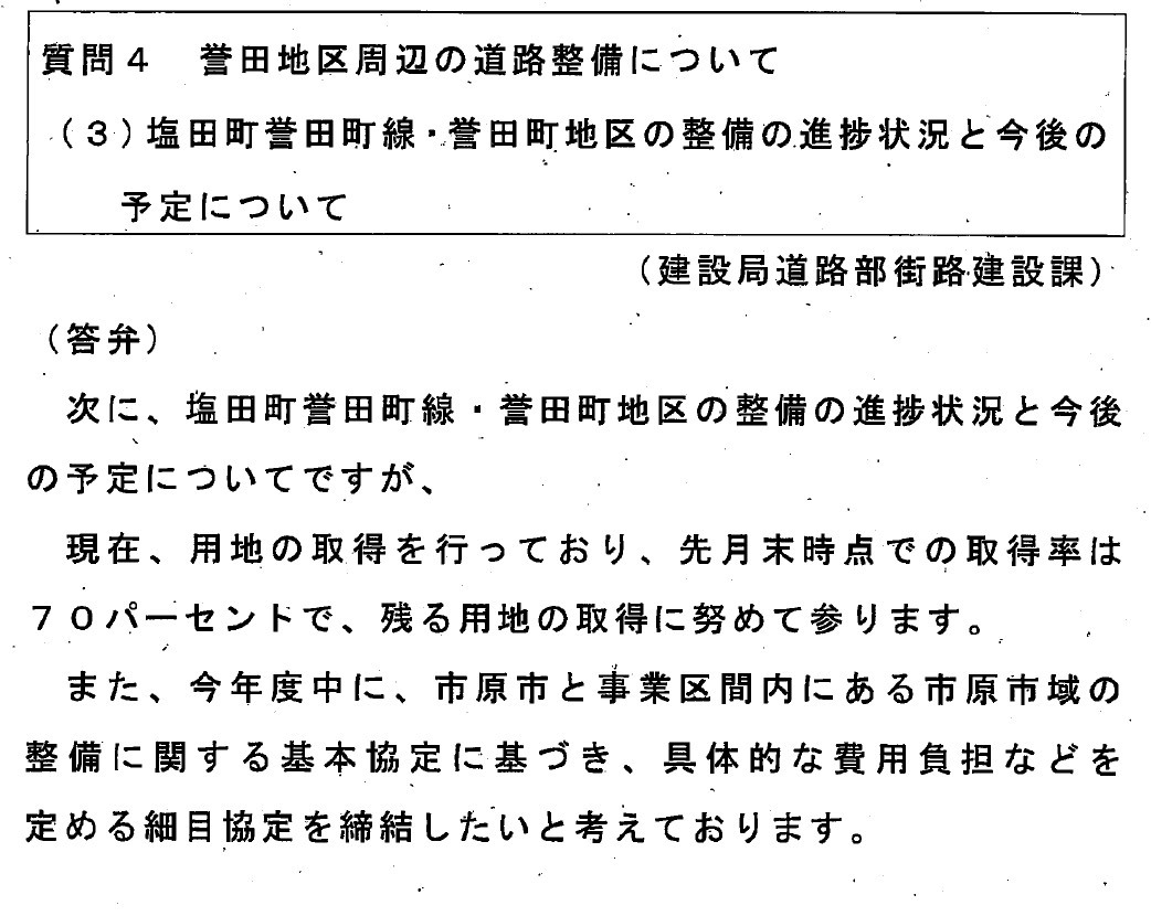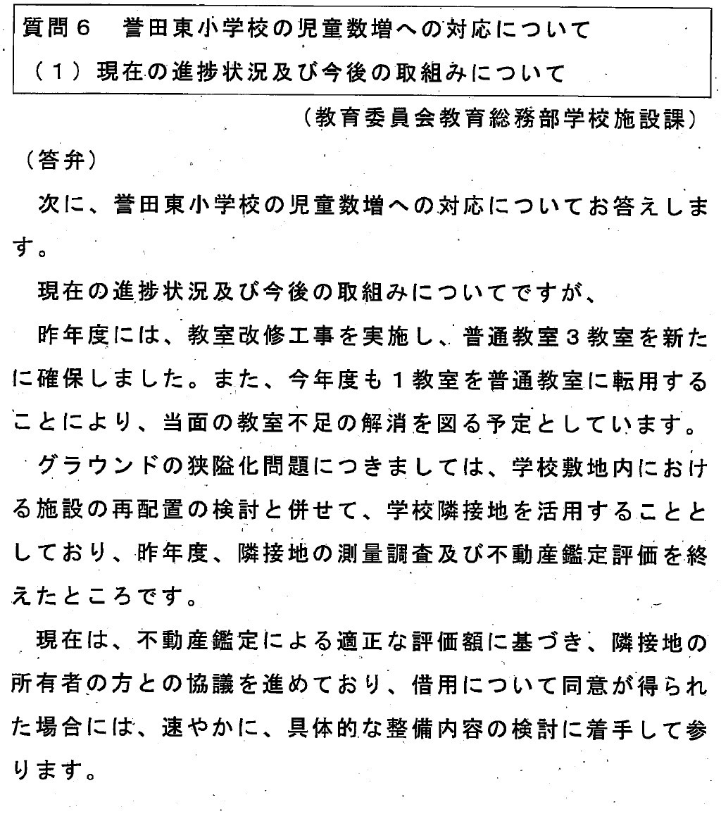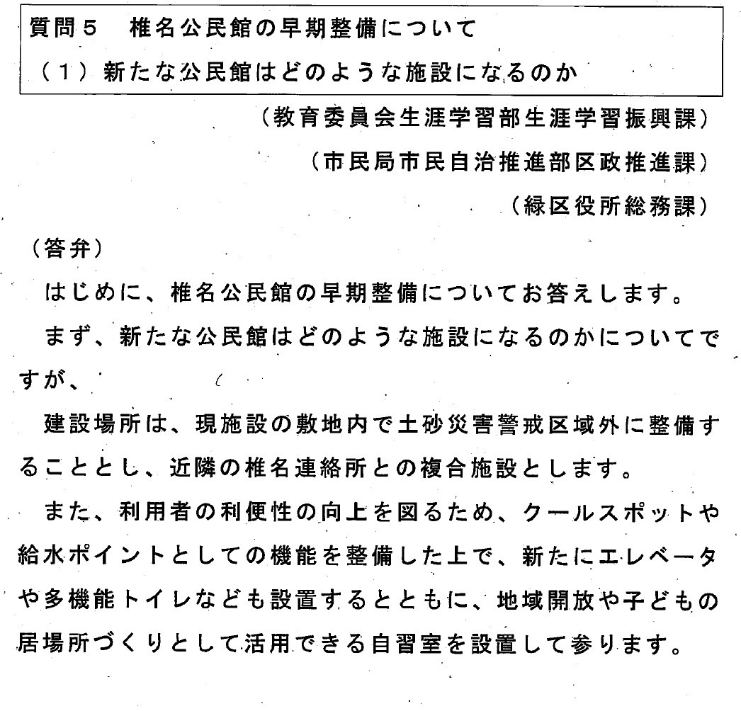 4 誉田地区周辺の道路整備について 次に、誉田地区周辺の道路整備について、伺います。 誉田駅周辺では、「たかだの森ニュータウン」などの住宅開発や、産業用地である「ネクストコア千葉誉田」の創業によって、地域全体が活気づいております。 一方で、誉田地区の道路事情は、もともと大綱街道や十文字踏切付近の渋滞の交通課題を抱えており、経済活動が盛んになることで、更なる渋滞の悪化が懸念されます。 このため、大網街道のバイパスとなる生実本納線の高田インターチェンジのフル化や、唯一の未整備区間である赤井町地区にはじまり、誉田駅前線と、この進捗に大きく影響を与える雨水管の整備など、これまで幾度となく訴えて参りました。 これらが整備されれば、大網街道の渋滞 緩和や物流の円滑化など、地域の発展をもたらす効果は大きく、住民は一刻も早い完成を待ち望んでおります。 誉田地区は、今まさに産業と市民生活が発展している中で、市長がマニフェストに掲げる都市基盤の強化に向けた道路ネットワークの整備が必要不可欠であり、地域が抱える 交通課題の解決にもつながることから、その実現を大いに期待しております。 そこで、誉田地区周辺で進められている各事業の進捗について伺います。 1点目に、「生実本納線」について、 2点目に、「誉田駅前線」の駅前広場、駅前道路及び雨水管整備について、 3点目に、「塩田町誉田町線 誉田町地区」について、 4点目に、「大膳野町誉田町線」について、 最後に、「誉田町2丁目八幡神社前交差点」について、 以上の5点の進捗状況と今後の予定について、お答えください。 5 椎名公民館早期整備について 次に、椎名公民館の早期整備について、伺います。 椎名公民館は、昨年、地域の方々と緑区の我が会派の議員で早期に再整備を行うよう 公民館は、地域の学習や交流の場であることに加え、災害時に避難所としての役割を担う重要な施設であると考えております。 しかしながら、椎名公民館は、施設の老朽化だけでなく、令和元年に発生した台風により敷地の一部が土砂災害警戒区域に指定されており、平時はもとより、災害時の避難所としても地域の住民が安心して利用できる施設を早期に整備いただきたいと考えております。 そこで、2点伺います。 1点目に、新たな公民館はどのような施設になるのか、 2点目も、再整備に向けた今後のスケジュールはどのようになっているのか、 お答えください。 6 誉田東小学校の児童数増への対応について 次に、誉田東小学校の児童数増への対応について、伺います。 同校周辺では、大規模な宅地開発により子育て世代の転入が相次ぎ、この4月にも180人近い児童が入学するなど、児童数が急増しております。 この影響により、特別教室等の普通教室への転用のほか、校庭の一部にプレハブ校舎が建設されたことにより、グラウンドが狭隘となり、体育の授業や休み時間の遊び場としても十分とは言えず、児童の健全な発育に必要な運動機会の確保が困難となりつつあります。 こうした中、保護者の皆様をはじめ地域住民の方々からも切実な声が多数寄せられており、地域全体の強い関心を集める重要な課題となっております。 私自身も、これまでの定例会において繰り返しこの問題を取り上げ、前回の第1回定例会でも確認したところ、グラウンドの拡張については、周辺土地の測量及び不動産鑑定が終われば、所有者の方と交渉を進め、その後同意が得られれば、具体的な整備内容の検討を行うという趣旨のご答弁でした。 そこで伺います。 現在の進捗状況及び今後の取組みについて、お答えください。