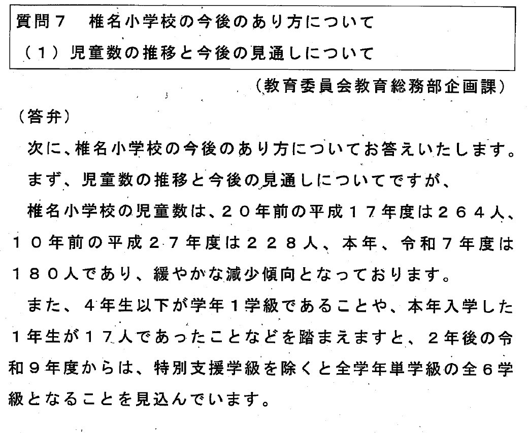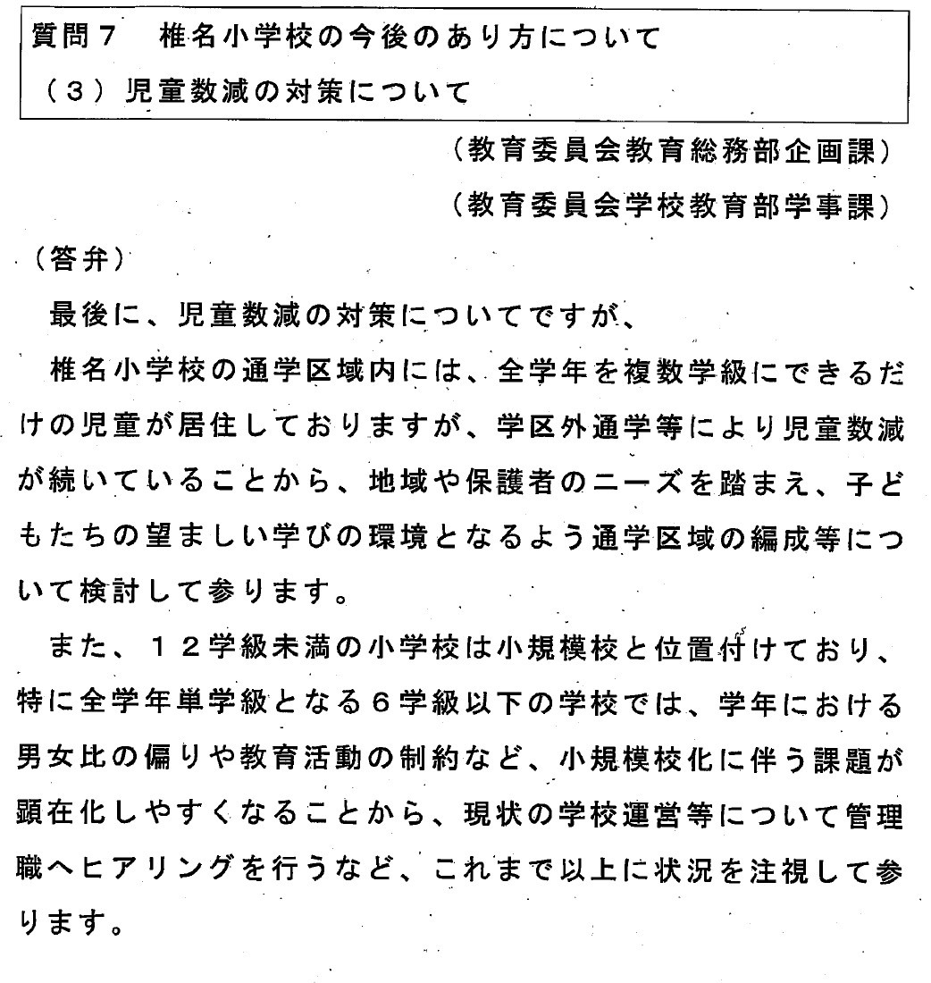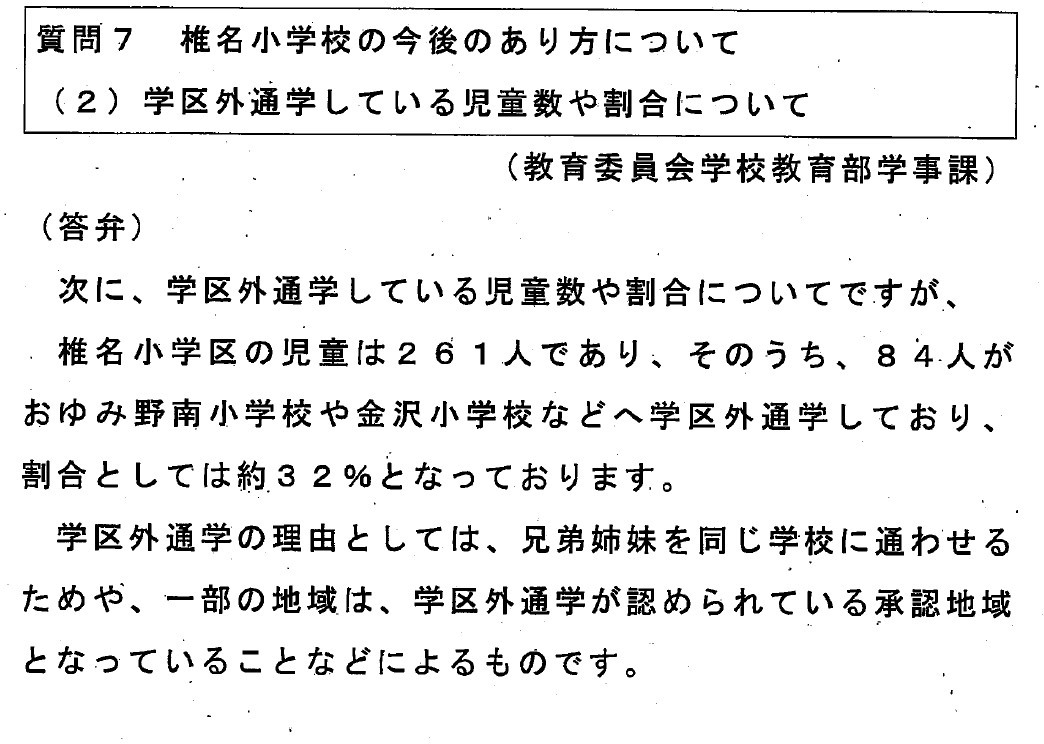 7 椎名小学校の今後のあり方について 次に、椎名小学校の今後のあり方について、伺います。 先ほどの児童数増への対応については、 今年度の椎名小学校の児童数は180人であり、これは、誉田東小学校の1年生の人数と同程度で、地域間の児童数の偏りが顕著に表れています。 また、通学区域が隣接するおゆみ野南小学校の児童数は425人となっています。 近年、椎名小学校の通学区域内の一部では、新たな住宅が建築され子育て世帯の転入も そこで椎名小学校について3点、伺います。 1点目に、児童数の推移と今後の見通しについて、 2点目に、学区外通学している児童数や 割合について、 3点目に、児童数減の対策について、 お答えください。