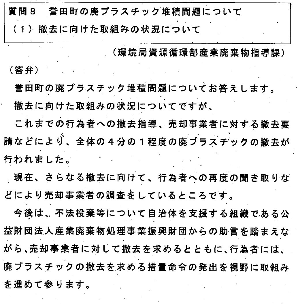 8 誉田町の廃プラスチック堆積問題について 最後に、誉田町の廃プラスチック堆積問題について、伺います。 私は、これまでも、議会の中で問題提起させていただき、市当局には行為者に対する強い指導と、行為者による撤去が進まない 廃棄物の重みにより壁の倒壊が発生した場合、居合わせた周辺の幼稚園児や保護者が下敷きになってしまうのではないか、細かな廃プラスチックが飛散し園児の目に入ってしまうのではないか、また何らかの原因で火災が発生すれば周辺への被害も考えられ、心配がつきない状況であり、一刻も早い解決が そこで、伺います。 撤去に向けた取り組みの状況について、 お答えください。 以上で、1回目の質問を終わります。