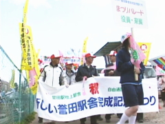 | 自由通路幅員7.5メートル、エスカレーター、エレベーターを設置して立派な駅が1年5ヶ月間工事関係者の努力で平成18年3月22日完成し、鶴岡市長初め誉田東小の子供達や関係者による、テープカットや渡り初めが盛大に行われました。 |