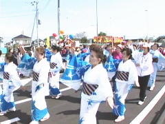 さくら公園から誉田駅までのパレードは、「鉄道唱歌」を演奏する誉田東小学校児童を先頭に、舞踊グループの総勢300人の皆さんが「緑区音頭」の踊りで続き。八幡神社の御神輿、お囃子、山車など150人程の皆さんも加わって、誉田のまち始まって以来といわれる程の盛大なパレードとなりました。