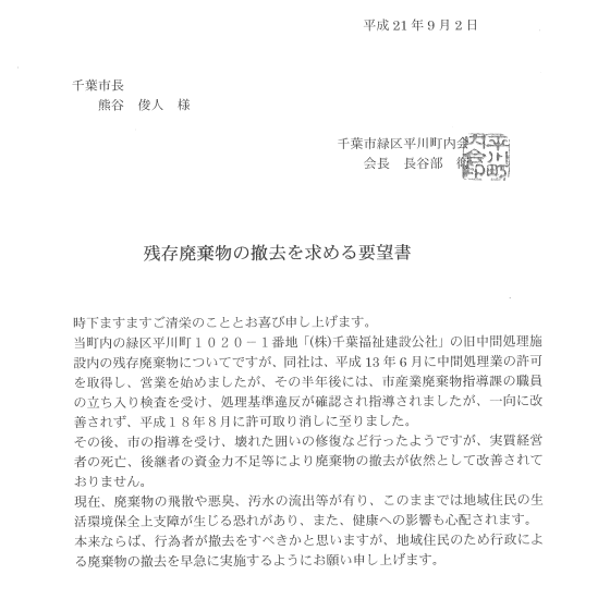 平成21年9月2日に市長へ「残存廃棄物の撤去を求める要望書」が緑区平川町内会より提出されました。