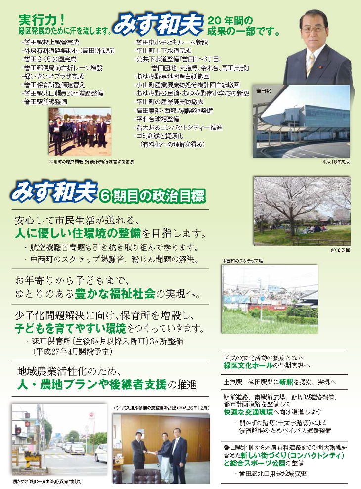 誉田中学校の隣の(開発面積26、1ヘクタールの広大な原野(一部農学部で使用) 今から20年程前、私が市議会議員になって2期目のころ、誉田中学校隣の明大用地に農学部を移転、あるいは一学年が学ぶ校舎にするとかの話が持ち上がりました。私は、誉田の街の発展のためにも、このチャンスを逃すまいと地元の自治会の役員や商店会の 名土とともに駿河台にある明大本部に何回か陳情に行きました。 その後残念ながら明大農学部は川崎市にある生田キャンパスに移転し話が立ち消えなっていました。しかし私はその後も市議会の質問で何度も明大のその後の動向や千葉市で購入して。活用すべき、と訴えてまいりましたが、市は26、1haという広大な敷地を購入し、地区ホールや公園にするほど財政は豊かではありせん。 6年ほど前、明大が用地を売却するということが明らかになりました。私は、大天の不動屋が従来の手法で戸建て住宅地にしてしまっては、緑区の人口は増えても、長期的に考えれば、千葉市にとっての経済効果は得れないと考えました。 緑区をベットタウンから職住接近の街にしたいと思い立ち、何度も市幹部に市にできることはないか、と直談判したり、市議会での提案を重ねました。そのころ千葉市では新産業用地の育成を検討しており、いくつかの候補地の中から誉田の明大用地に白羽の矢が立てられました。千葉市はここに10億円の資金を投入し、道路や下水を整備することをうたい開発事業者を募ったところ(株)M・Kという街づくりを得意とする会社が決定現在に至っております。 こうして積年の私の思いが実現致しました。そして早い所では1年位後には工場が動き出し地元の皆様も働く職場ができます。全社で1000人位の人が働く食品関係の工業団地が誕生致します。 私は工業団地ができて終わりではありません。工業団地を進める中でも道路問題、開かずの踏切の問題を解決しなければ、市長局と交渉してきたところです。しかし踏切を解消する新しい道路を作るには時間がかかります。皆様の力を貸していただき、私も努力をしていきたいと思います。 令和2年2月吉日 千葉市議会議員 三須和夫