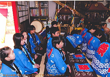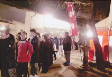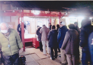 近年は、この八幡神社にも大勢の参拝者が訪れるようになりましたが、今年は、大晦日と元旦で1500人位の参拝者がありました。氏子とお囃子連の皆さん参拝者に温かい甘酒、みかん等が振舞われました。