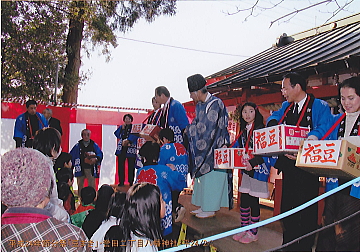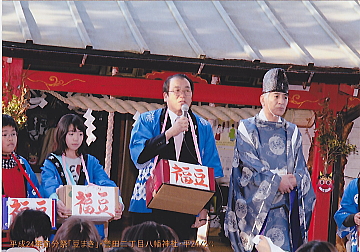 地元1丁目,2丁目,3丁目、各町内会長、東小学校 柳沢校長先生、商店会長、年男、年女が演壇から福豆やお菓子などを(福は内。福は内)鬼は外と勢いよく豆やお菓子をまきました。