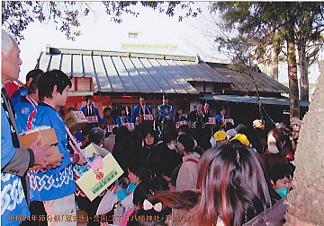 初めに神主様の儀式が執り行われ、続いて神社の境内に子供から大人まで500人くらいの人が集まり、氏子会長岸本氏の挨拶の後、三須和夫市議、関県議の挨拶がありました。