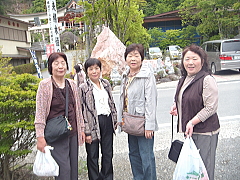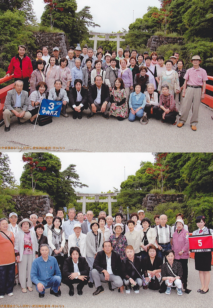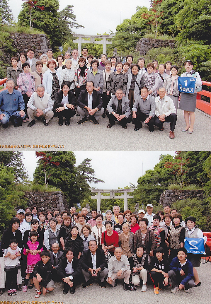 また武田神社をお参りして記念写真を撮り、一路誉田に帰りました。大型バス4台になりました。バスの中はアルコールも入りカラオケも盛り上がりました。ビンゴなど楽しい催しもあり、楽しい時間はあっという間に過ぎました。