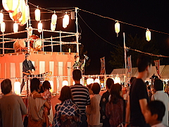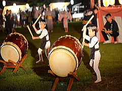 高山なおこさんの旦那さんは和太鼓「すめらぎ」の太鼓打ちの名手で、5歳の長男と一緒に太鼓を叩き盆踊りを盛り上げていました。