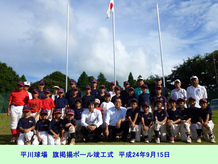 平成24年9月15日、子ども達も一緒に平川球場に国旗を掲げて竣工式が行われました。当日は、県議会関政幸先生や平川ファイターズの子供たちと福士代表、監督、コーチみんなで国旗が掲揚されると拍手で竣工式を祝いました。